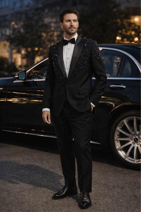 Shawl lapel tux with hand embellishment on front and arms giving it extremely premium looks