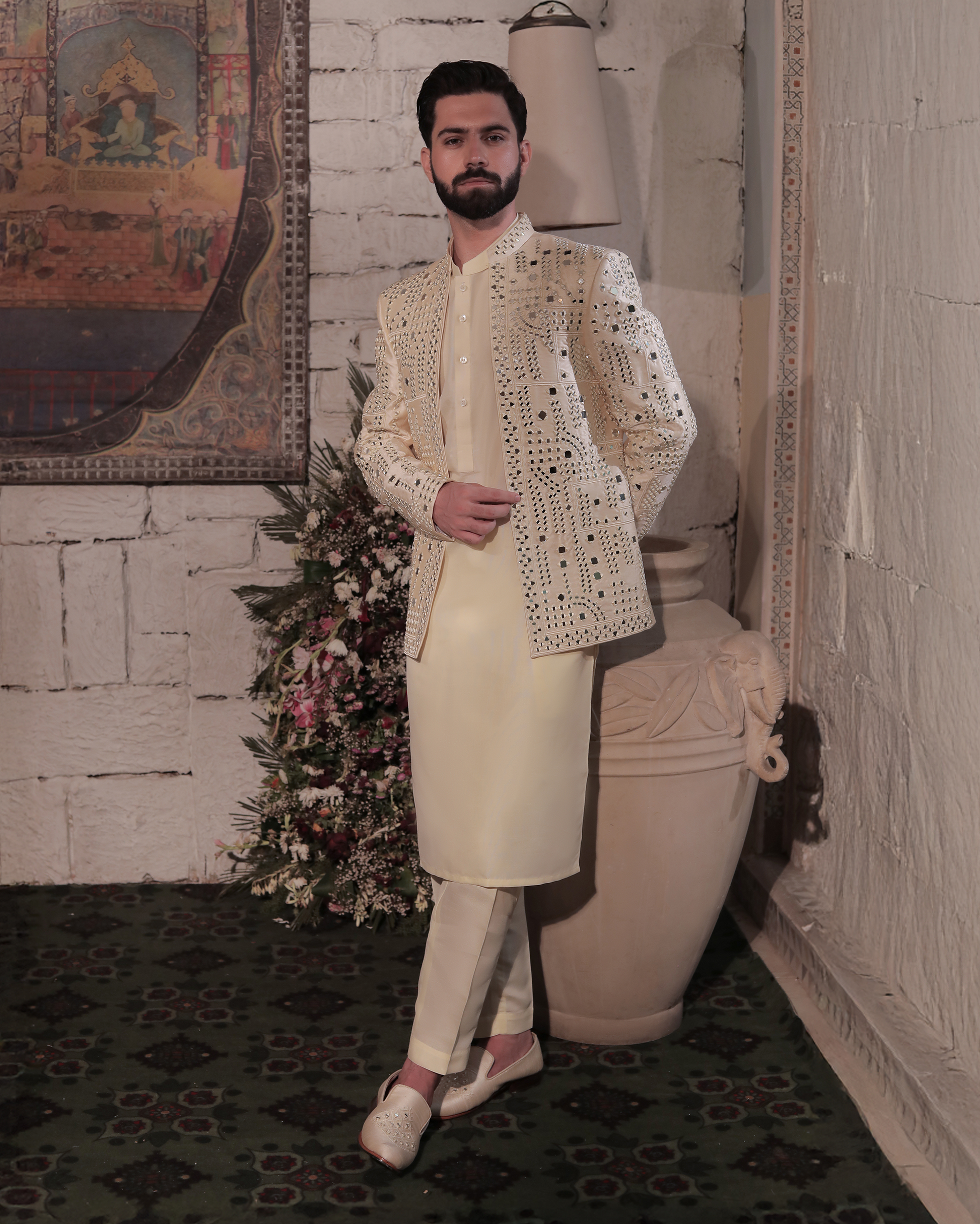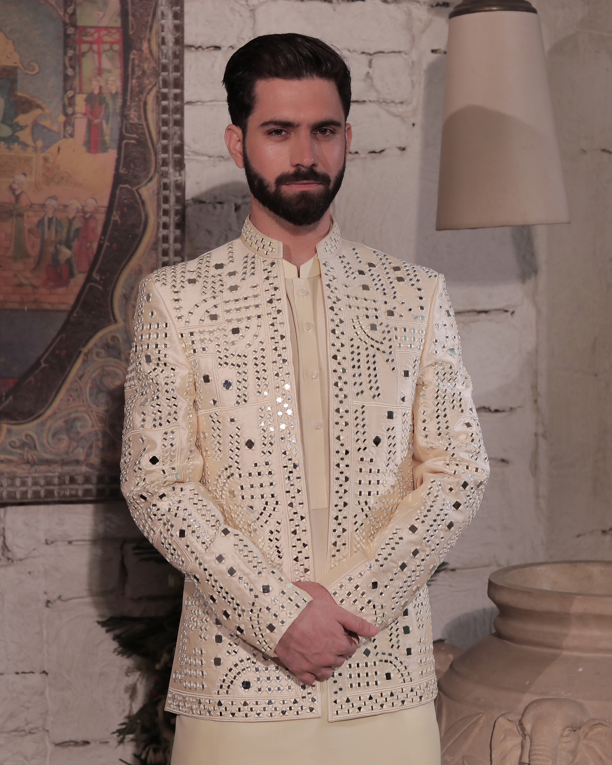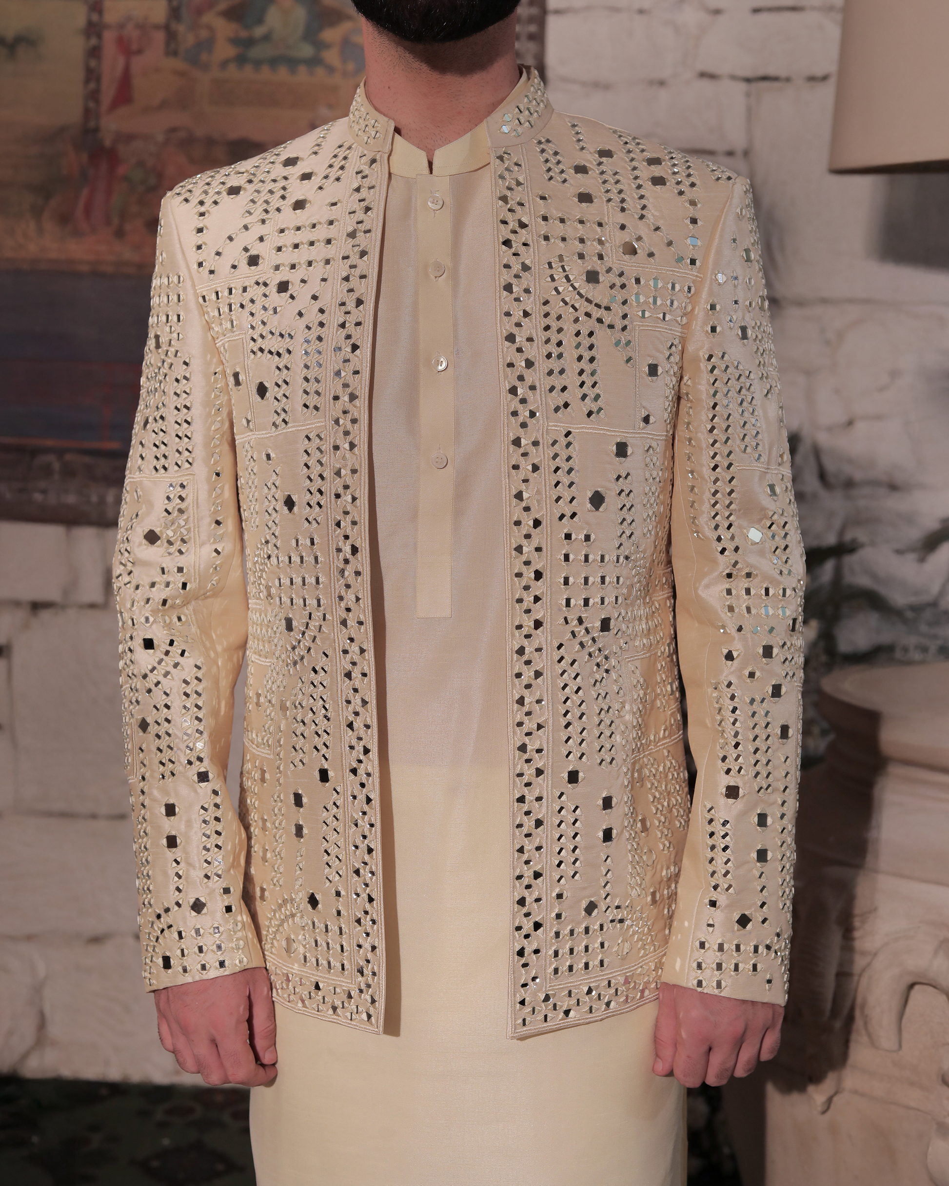 OPEN PRINCE COAT WITH RAO SILK BASE EMBELLISHED WITH MIRROR WORK FULL FRONT AND ARMS