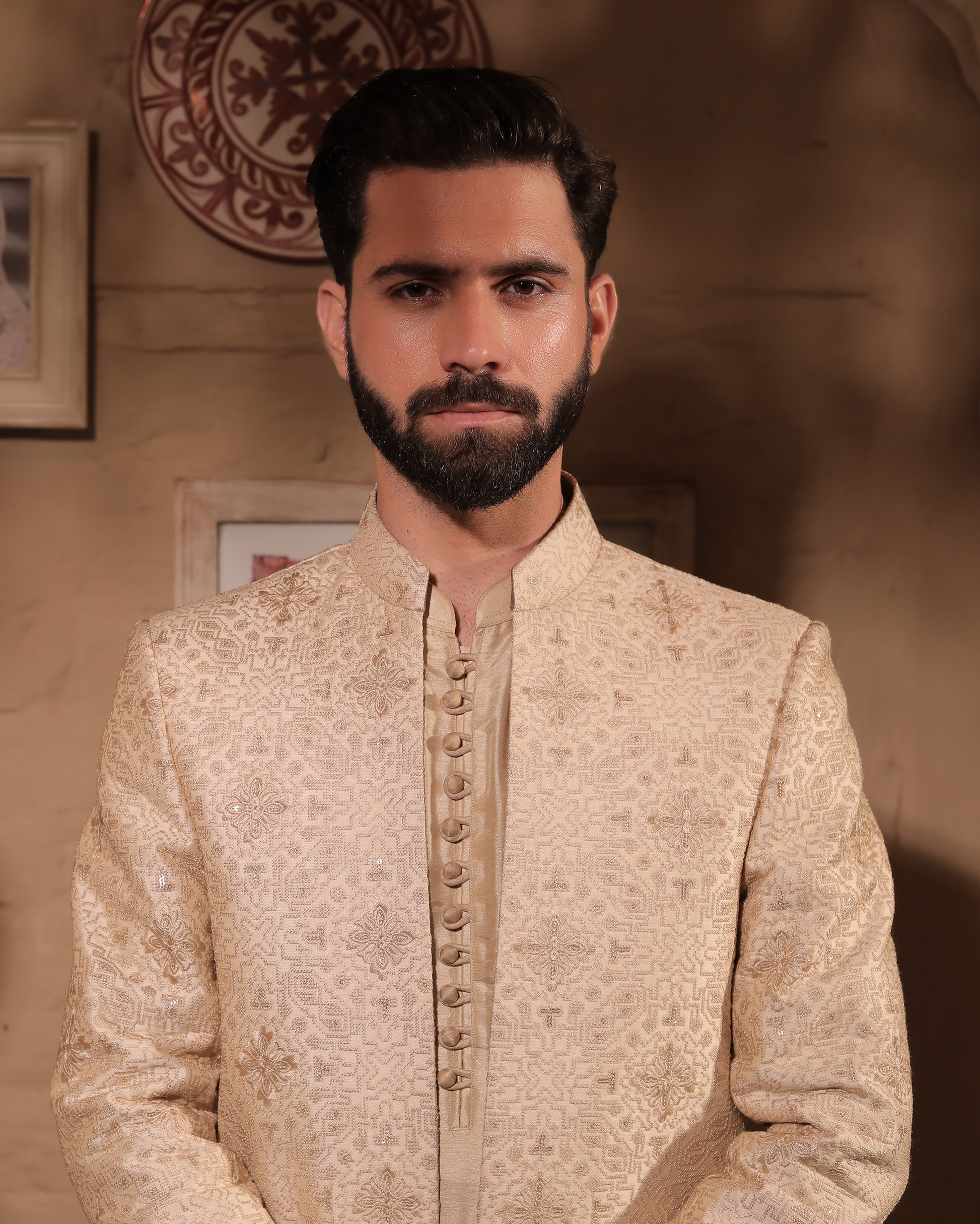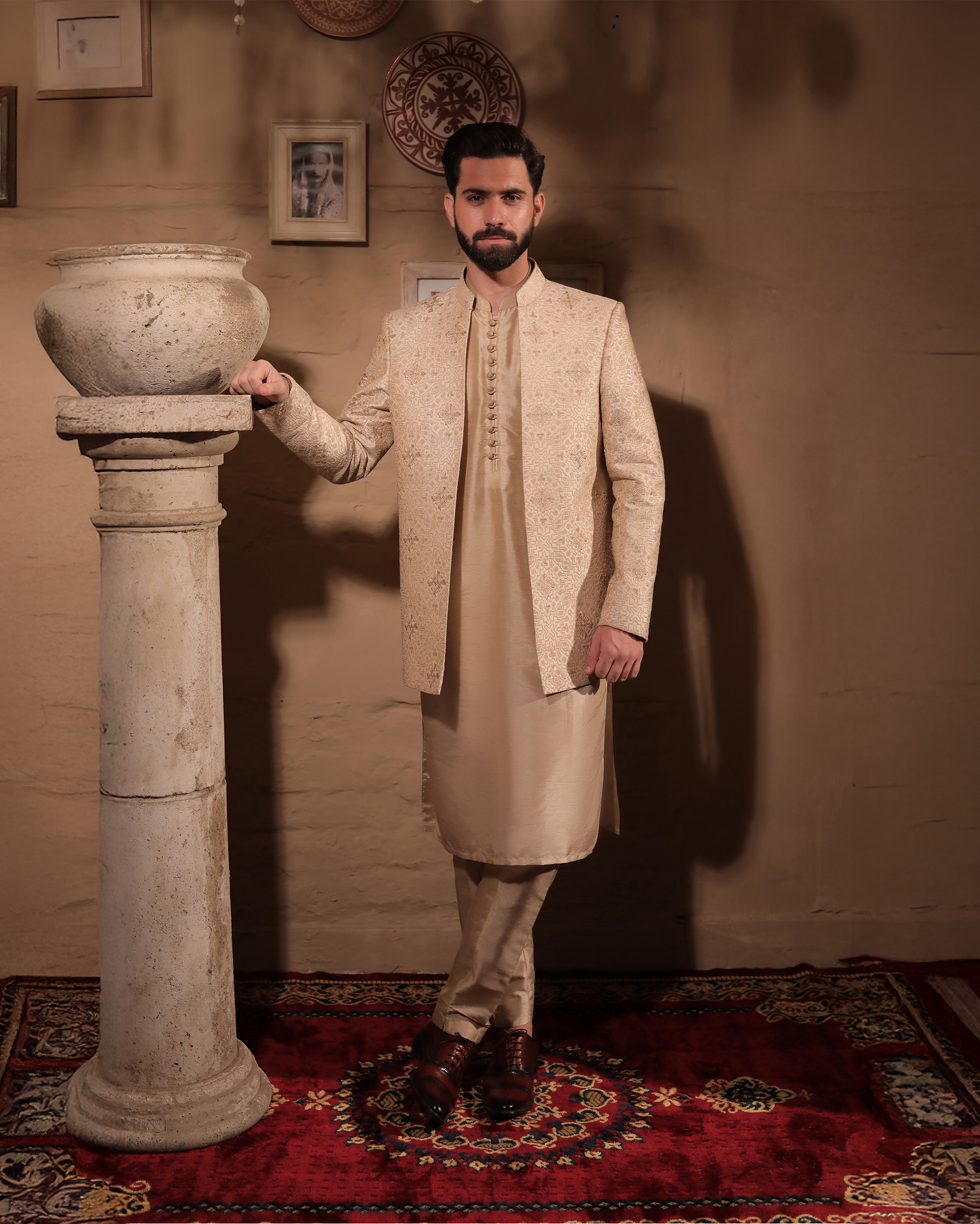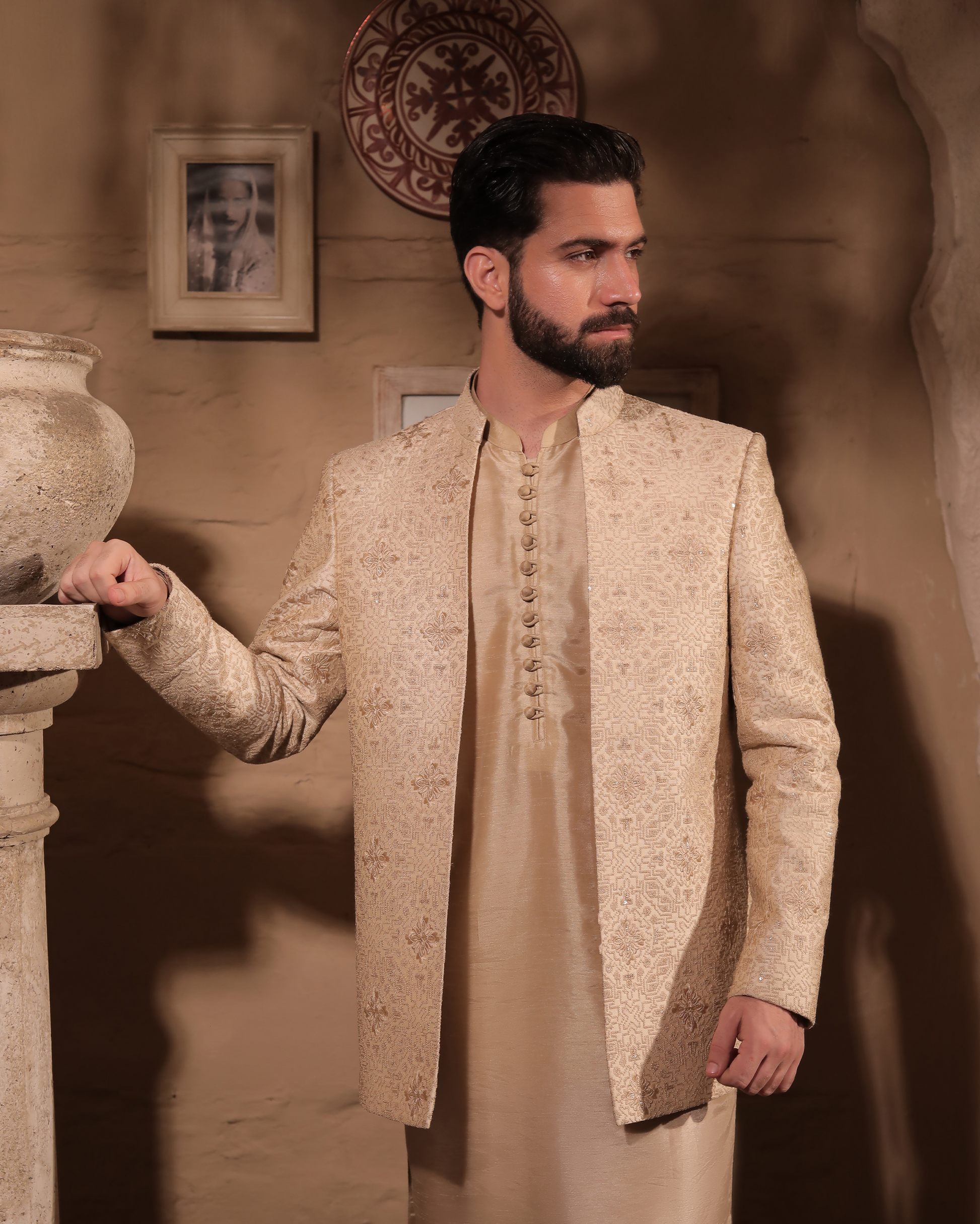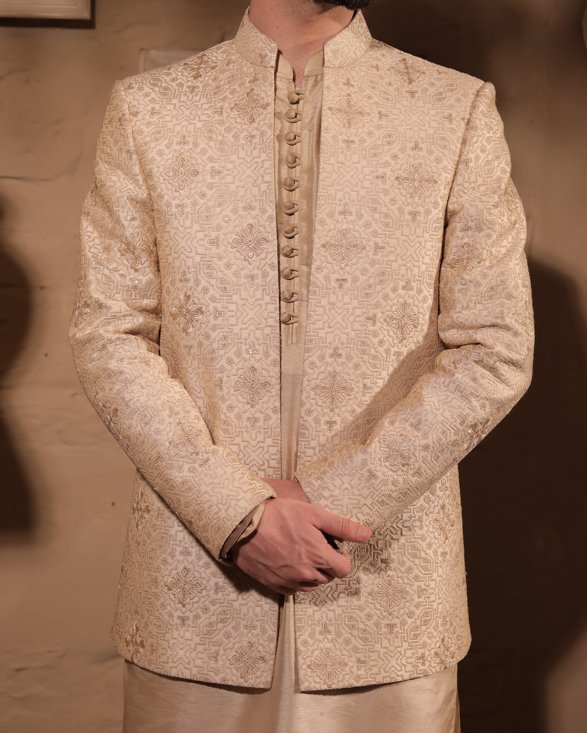 OPEN PRINCE COAT HAVING PREMIUM SELF EMBROIDERED FABRIC ADDITION OF MINOR SEQUENCE COMPLIMENTING MORE