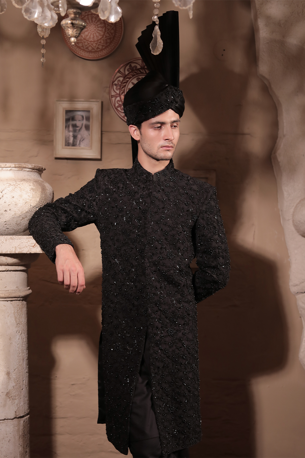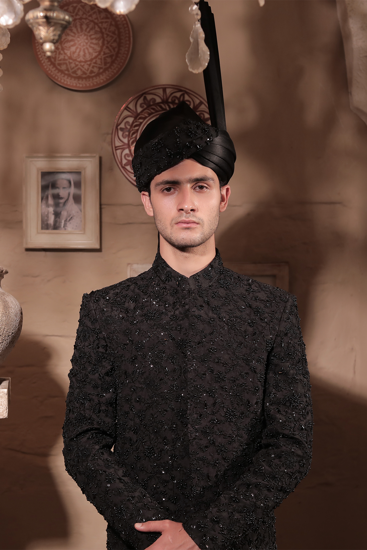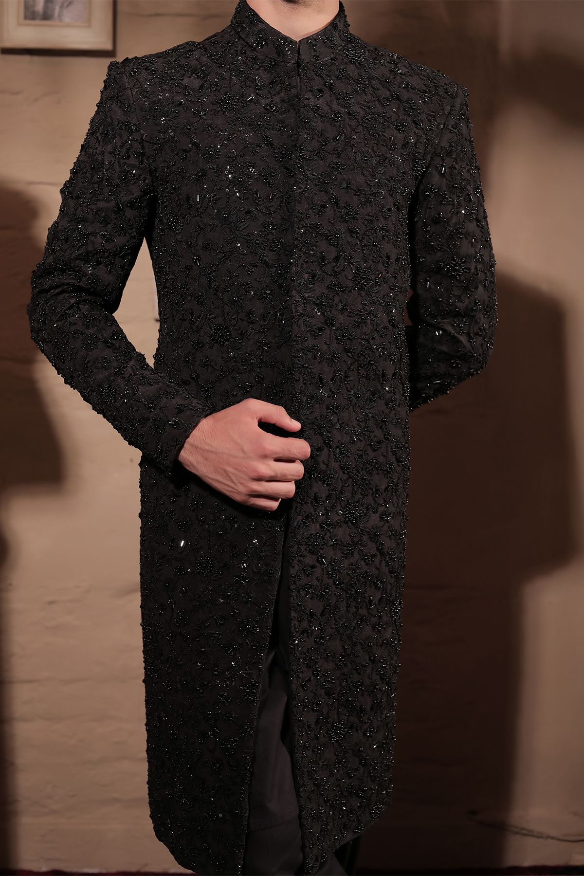 SHERWANI WITH LIGHT GOLD EMBROIDERED BASE BEAUTIFULLY HAND EMBELLISHED HEAVILY ON FULL FRONT WITH BROWNISH BRONZE EMBELLISHMENT GIVING IT FULL ROYAL LOOK