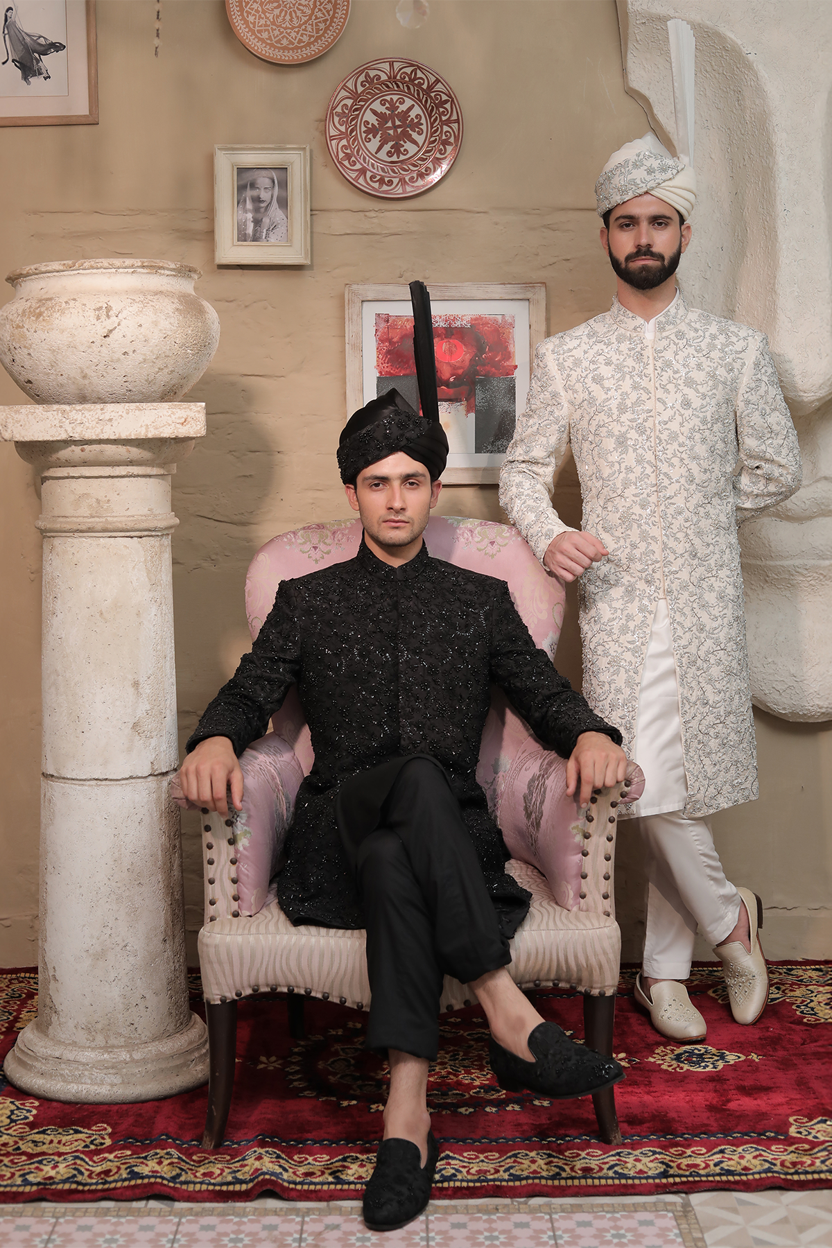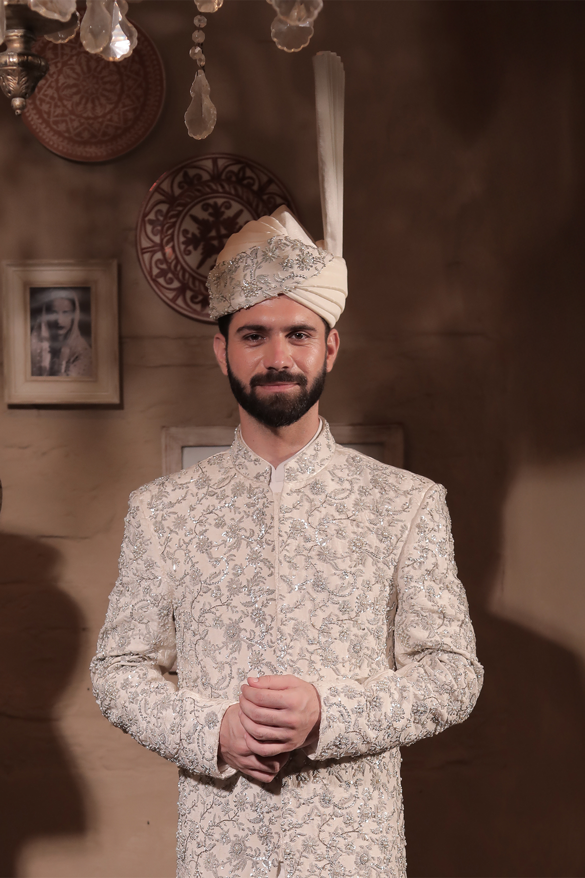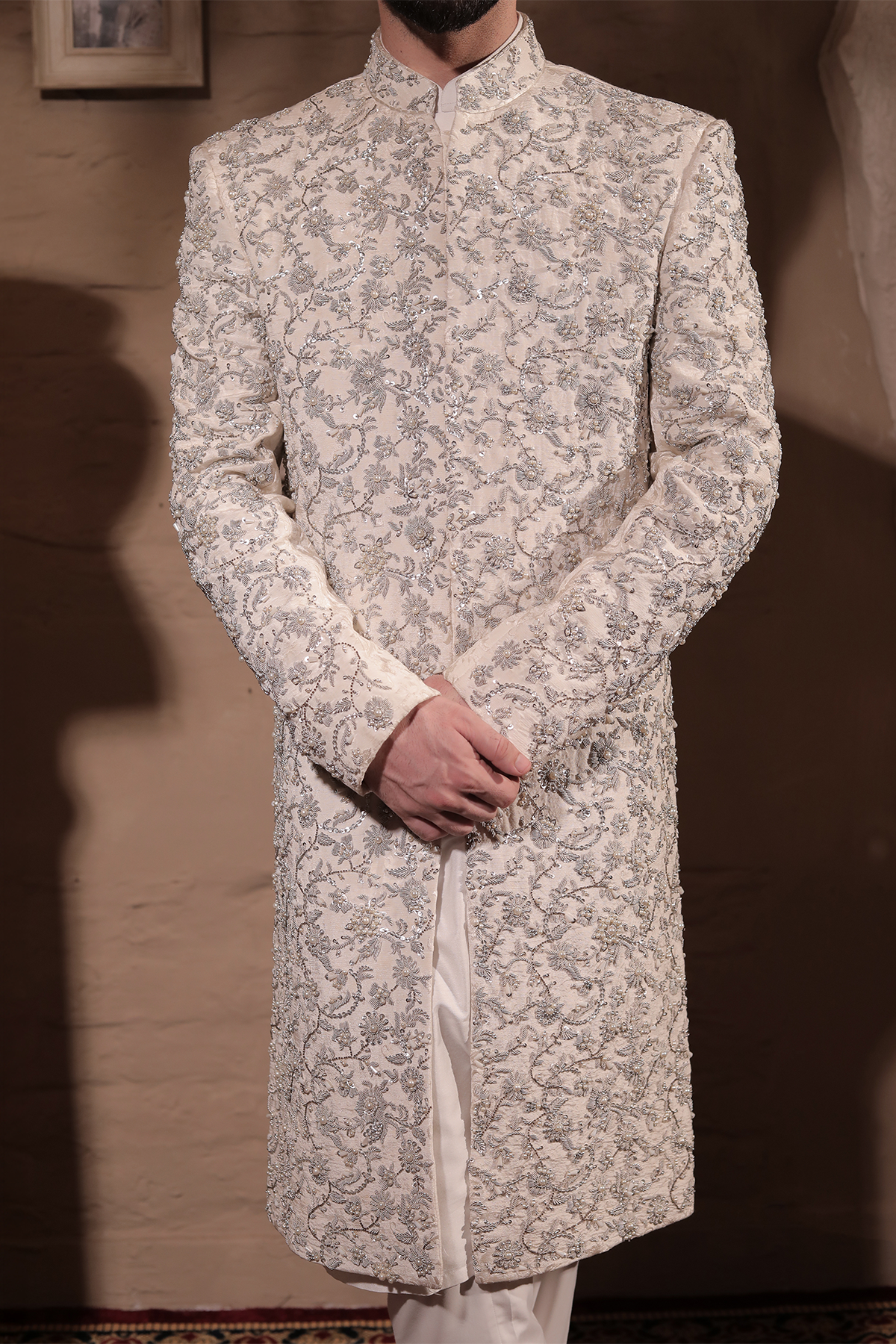 SHERWANI HAVING PREMIUM PURE SELF EMBROIDERED CREAM FABRIC HEAVILY COVERED WITH SILVER EMBALLISHMENT