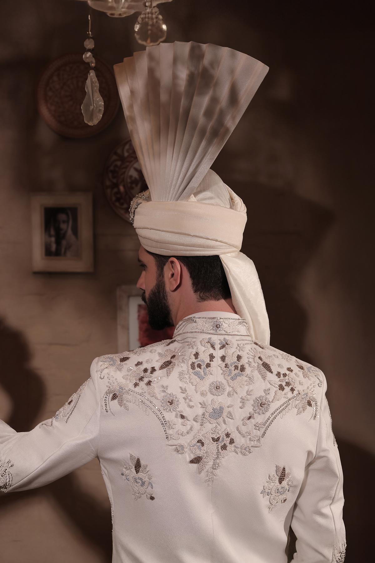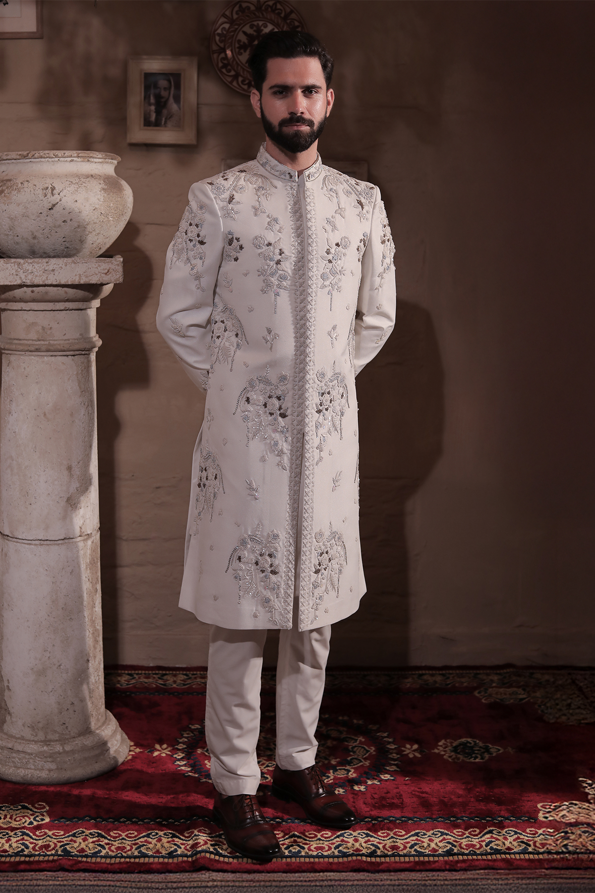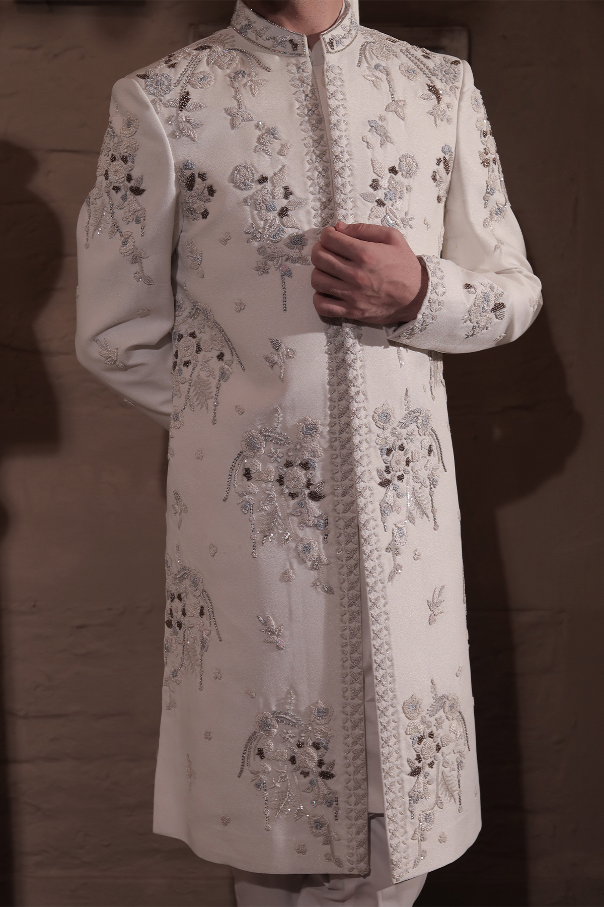 SHERWANI WITH BOSKI COLOR PREMIUM TEXTURED FABRIC HAND EMBELLISHED FROM FRONT AND BACK WITH RESHAM AND DIFFERENT MATERIALS USING COLORS OF WHITE, LIGHT GREY, CREAM AND SILVER GIVING IT A GREAT LOOK