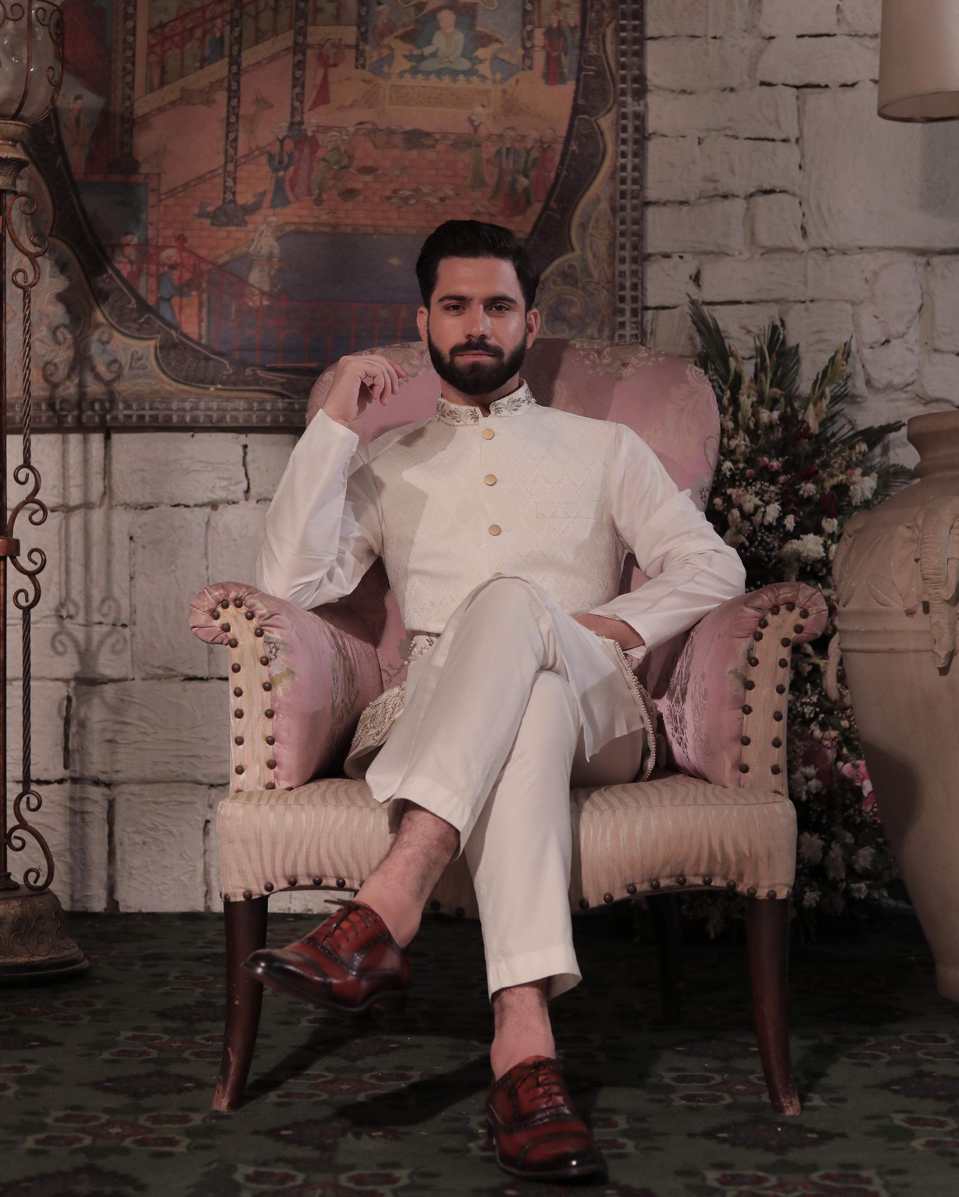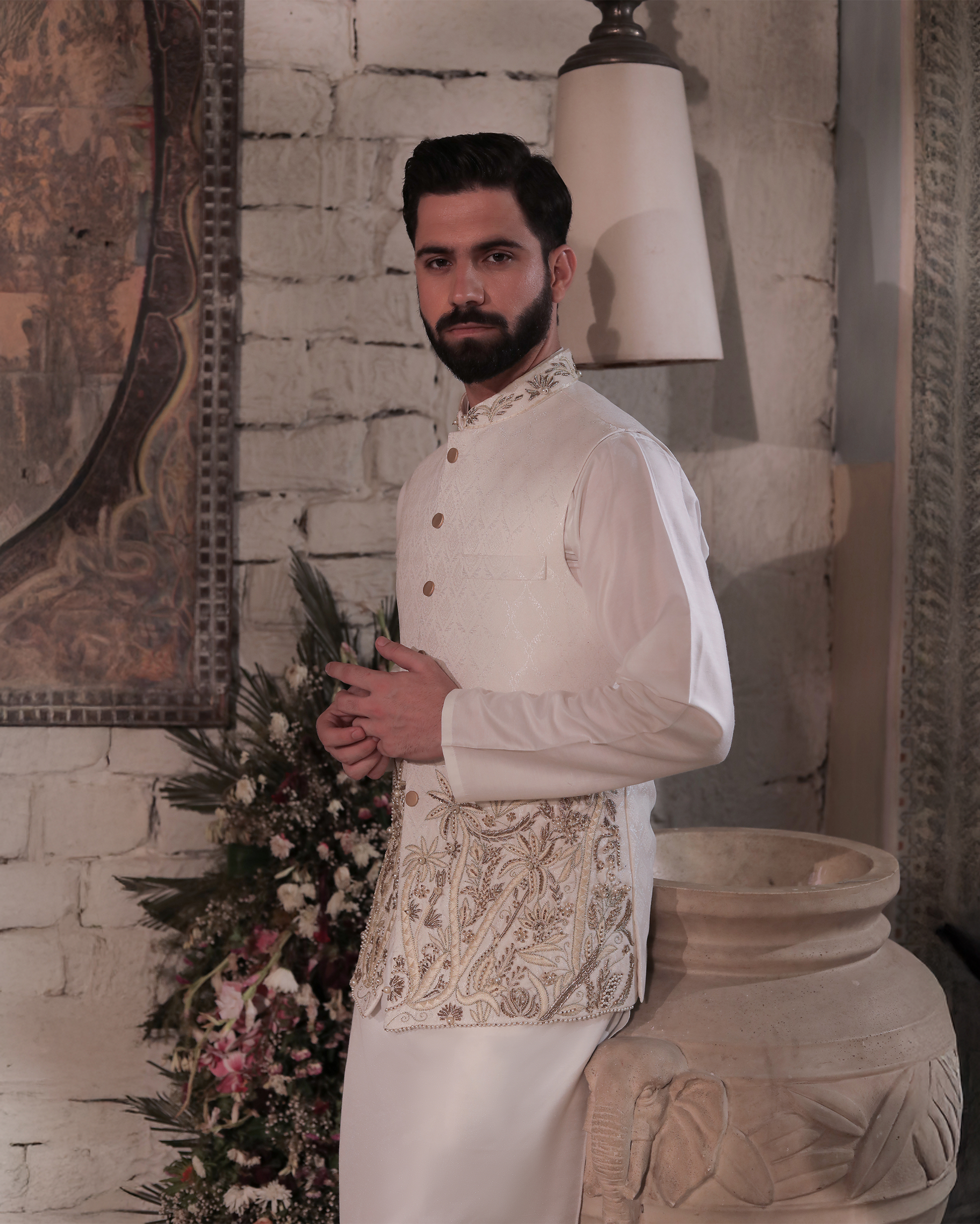 WAISTCOAT WITH OFF-WHITE JAMAWAR BASE WITH CREAM AND GOLD EMBROIDERY ON HALF BOTTOM FRONT & BAN COVERED WITH HAND EMBELLISHMENT AND PREMIUM GOLDEN BUTTONS