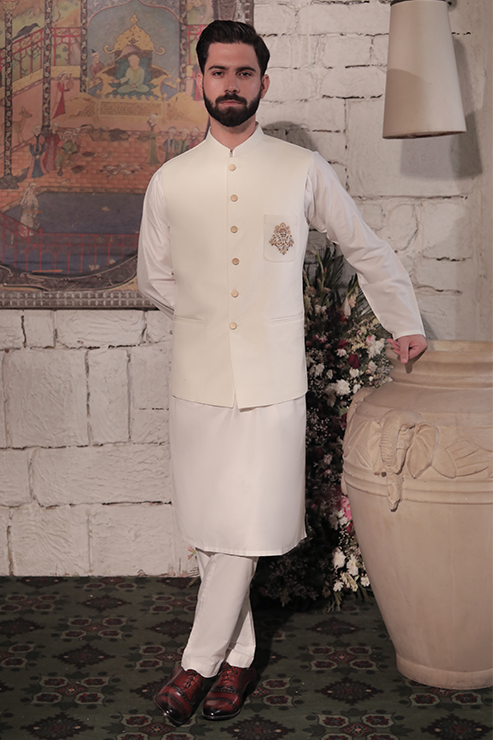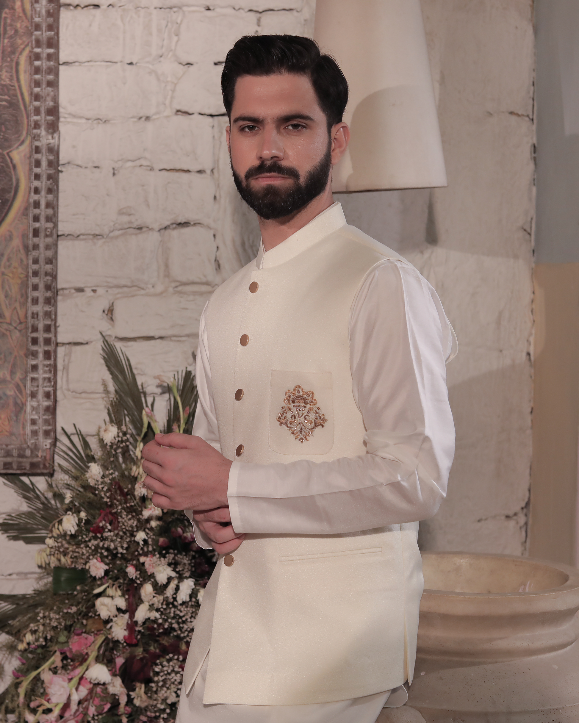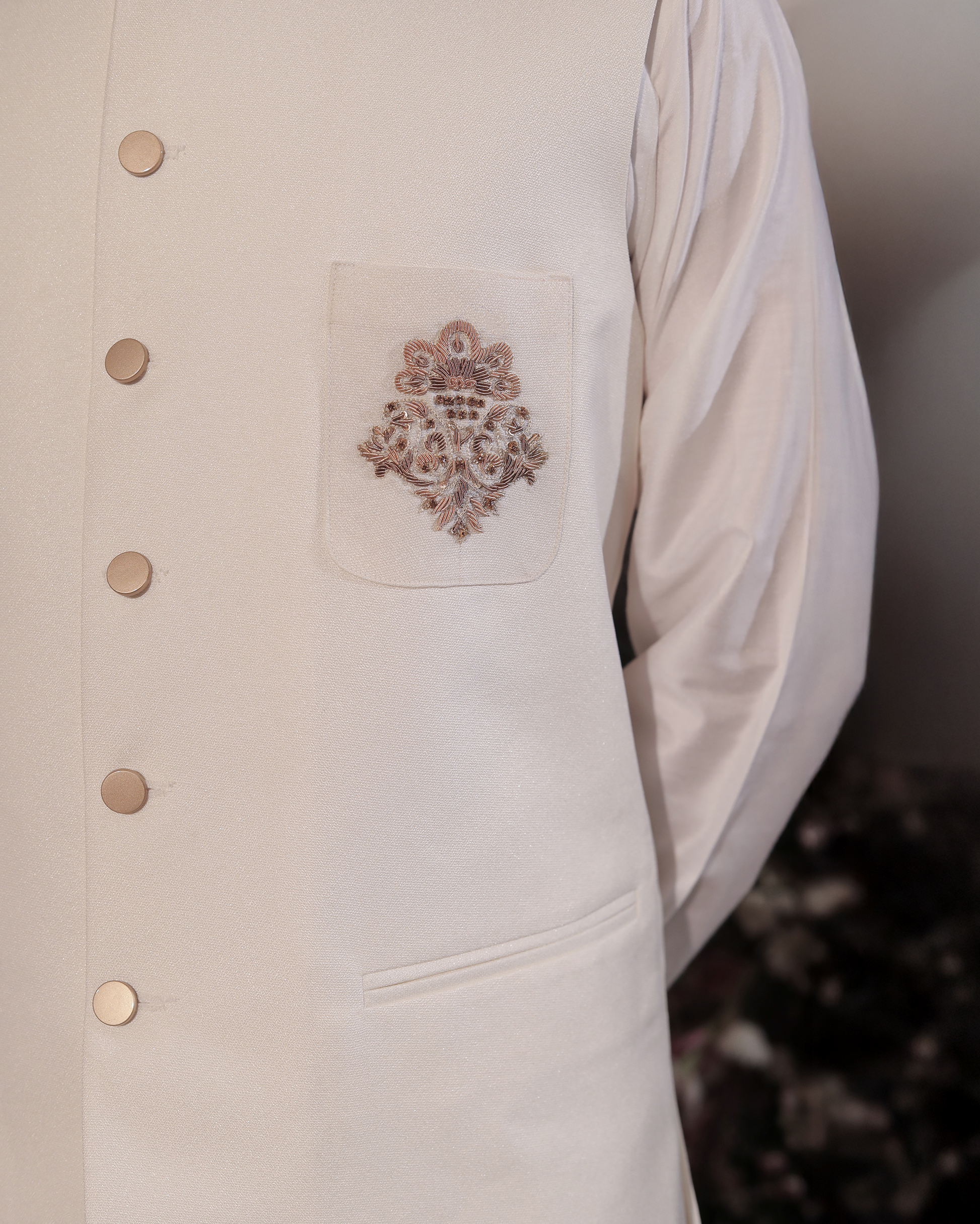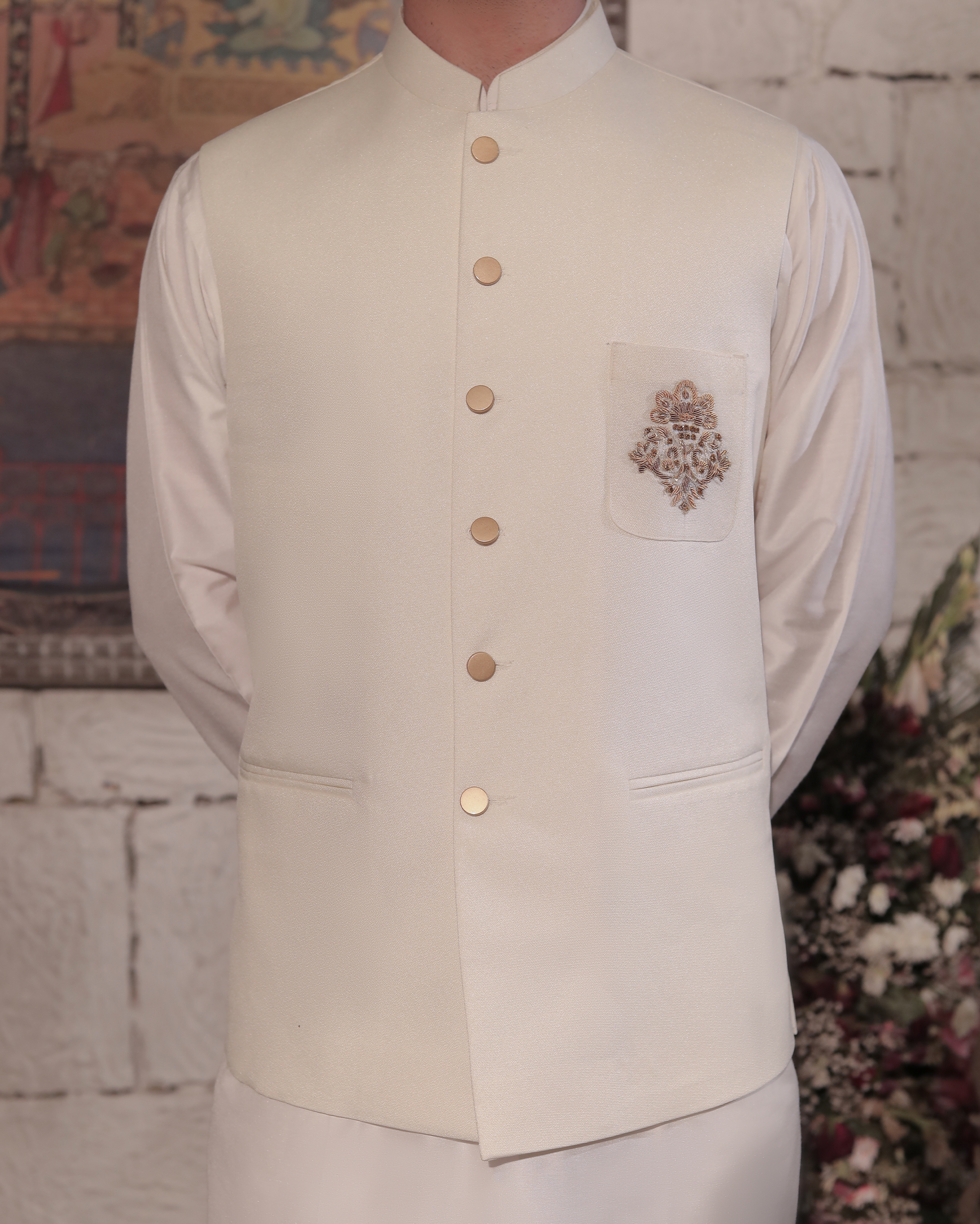 WAISTCOAT WITH PLAIN PREMIUM TEXTURED BOSKI COLOR FABRIC WITH PATCH POCKET HAVING GOLD COLOR HAND EMBELLISHED MOTIV AND PREMIUM METAL GOLD BUTTONS